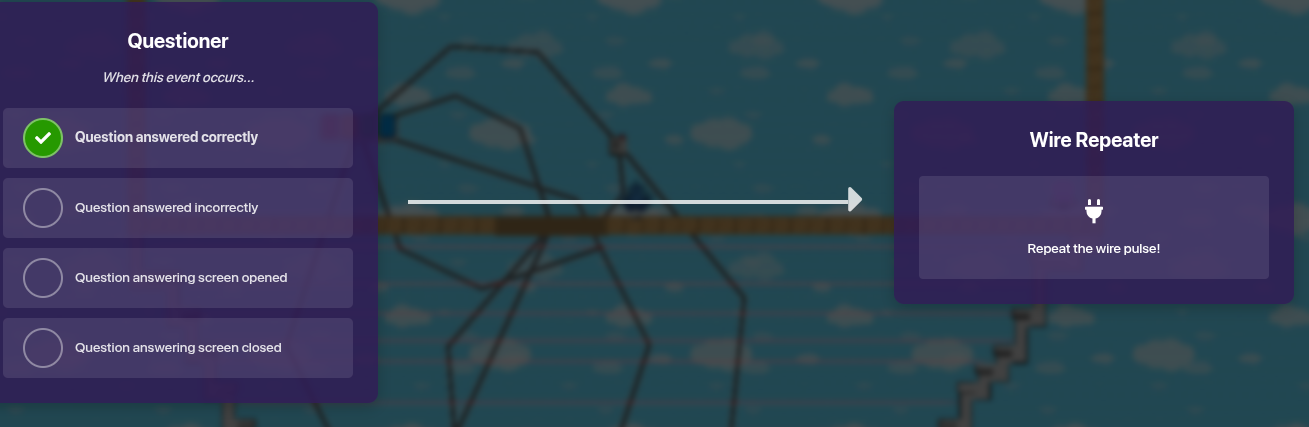 wire the Lazer that does damage to the questioner and chose player hit by Lazer, for the Lazer, and for the questioner chose close question answering screen
