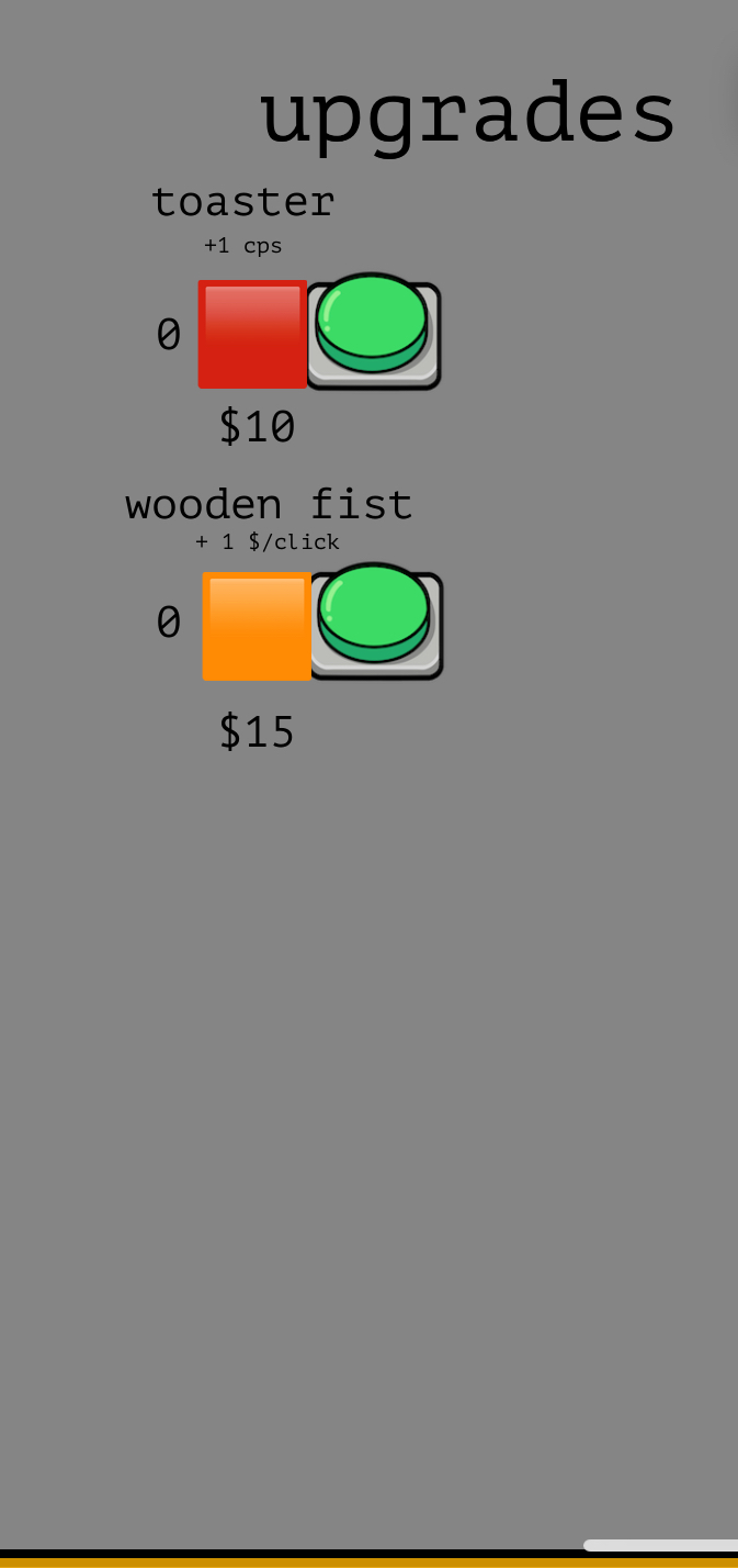 so, i’m making a cookie clicker game, and i need 8 upgrades that get progressively better. The upgrades can either upgrade the $ per click, or the clicks per second. I already have these 2.