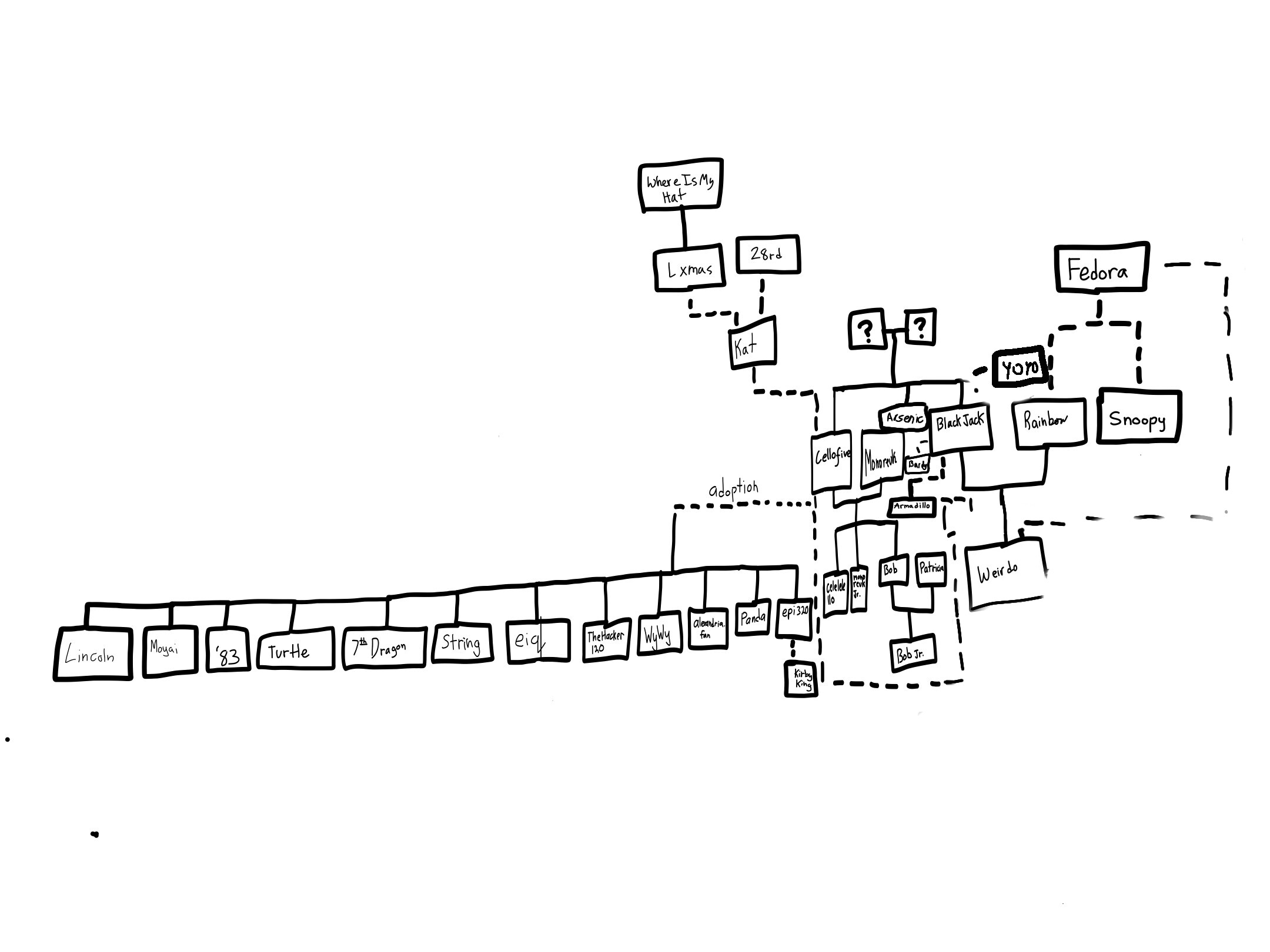 I was bring into the family tree by being created by @Blackjack and @Rainbow, aka my parents. Blackjack ended up giving me up to my uncle, who now has partial custody, @Cellofive, which is @Monoruek 's hubby. Then, @Fedora fought for some custody, then got married to Kero, my step mother. @Blackjack married @rekt, making @rekt my step father. IN TOTAL I have 2 moms and five dads. I also got married to my adoptive brother, yoyo, which I later divorced in order to marry Rainbow (don’t ask